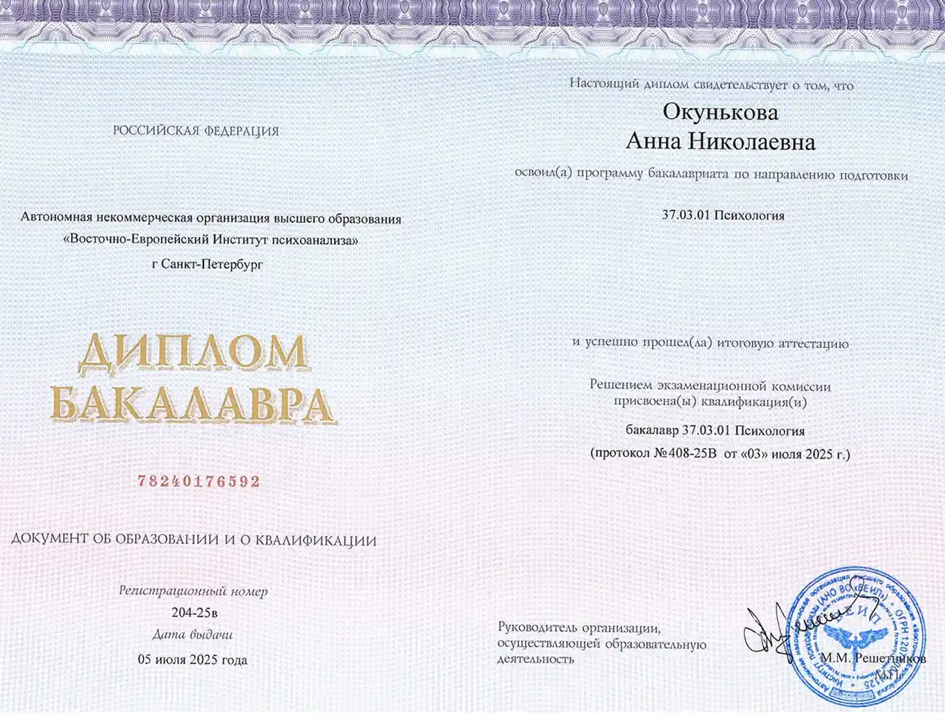 - 2021 - Центр эмоционально-образной терапии Линде Н.Д. (Сертификат о прохождении обучения по программе "Эмоционально-образная терапия")